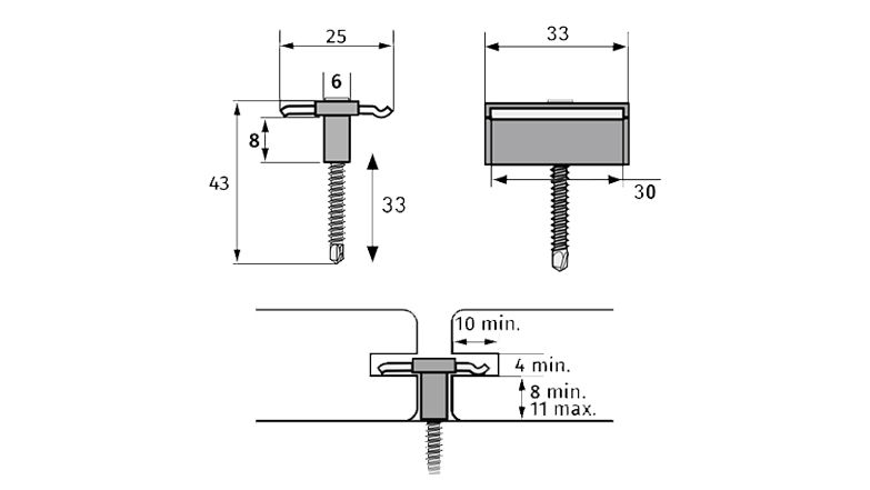 Le clip Cobra® Hybrid 8-25 est une fixation bi-matière de couleur noir mat afin d'éviter les reflets lumineux. Les crochets asymétriques en Inox 304 permettent de garantir un maintien et une stabilité efficace des lames contre la lambourde, sans contraindre le mouvement nécessaire du bois. Une seule vis est nécessaire par clip grâce à sa tête auto-foreuse, un simple embout (fourni avec ses clips et vis) permet de l'installer sans pré-perçage sur la lambourde.