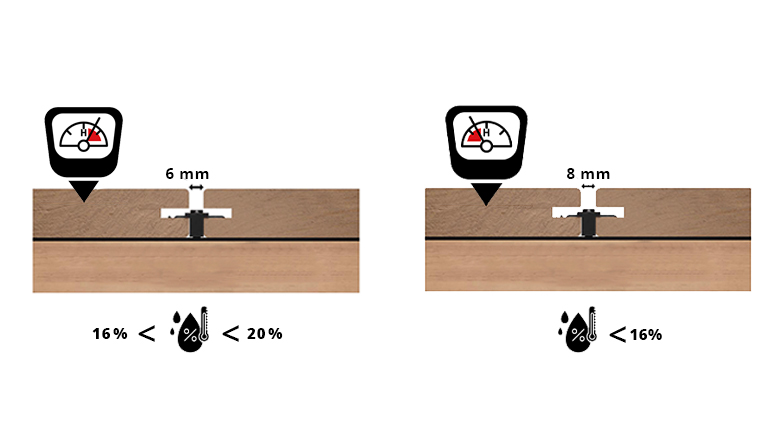 - Bois très sec : Dans un environnement avec un pourcentage d'humidité inférieur à 16%, veillez à respecter un écartement de 8 mm.