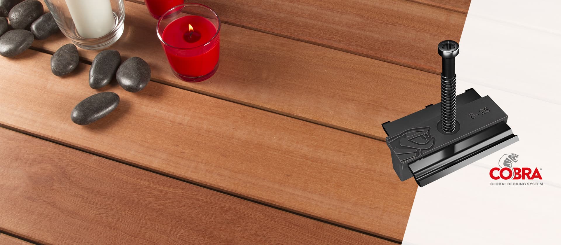 Le clip Cobra® Hybrid 8-25 est compatible avec tout type de lames en bois exotique, pour une pose sur lambourdes en bois ou en aluminium.
