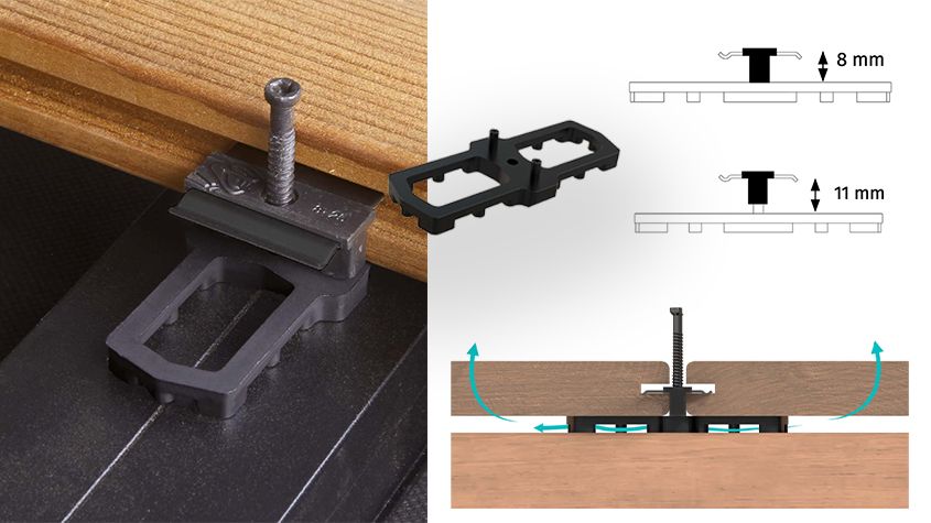 Ce clip pour terrasse est adapté aux lames en bois exotique (Essences stables et séchées KD) et bois thermo-modifié.