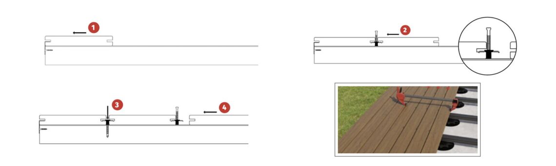 SCHRITT 3. Schrauben Sie den Clip fest, während Sie die Terrassendiele festhalten. Verwenden Sie einen Gummihammer, um die Diele richtig einzuschlagen. |