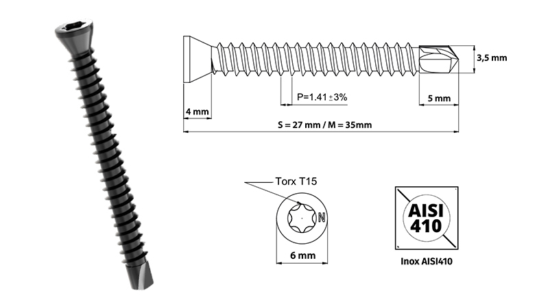• Schraube 4.2 x 27 mm Größe S und 35 mm Größe M aus Edelstahl AISI410.