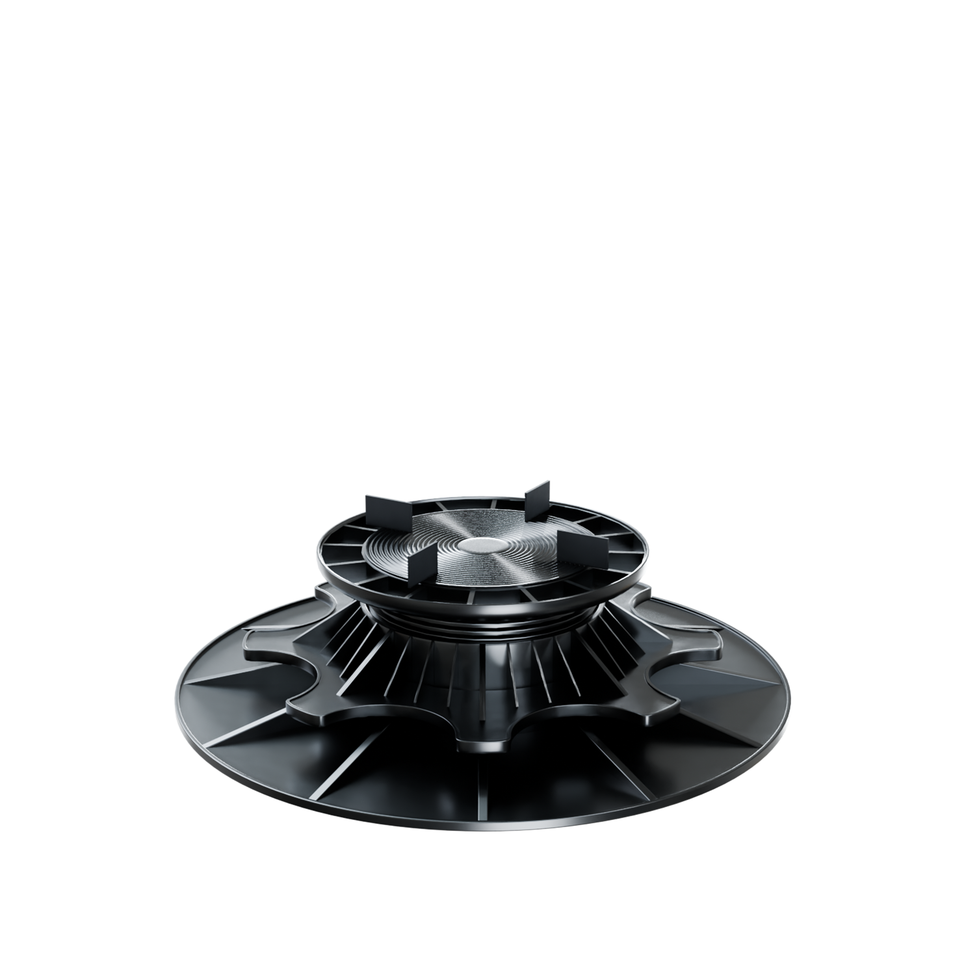 Verstellbare Stelzlager mit 4 abbrechbaren Fugenstegen zum Verlegen und Nivellieren von Keramik- oder Betonplatten. 5 Größen für Aufbauhöhen von 25–230 mm, mit stapelbaren 60-mm-Aufstockungen (max. 5) bis 530 mm erweiterbar. Präzise Höhenjustierung über Drehring. Tragfähigkeit bis 800 kg pro Stelzlager. Witterungs- und UV-beständig. Stabile 20-cm-Basis reduziert das Einsinken in den Untergrund – ideal für Flachdächer. Konform mit DTU 43.1 und DTU 51.4.