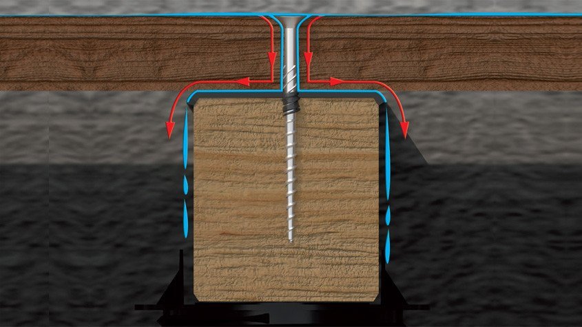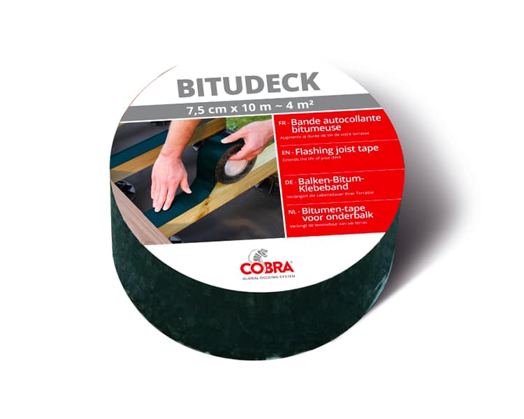 Der Bitudeck® Abdichtungsstreifen mit seiner Zusammensetzung auf Bitumenbasis verhindert jegliche Infiltration an der Oberfläche der Balken. Die Spitzen der Terrassenschrauben drehen sich in das Bitumen ein, wenn sie in die Balken eindringen, und bilden so eine viel effektivere Dichtstelle als ein einfacher EPDM-Streifen.